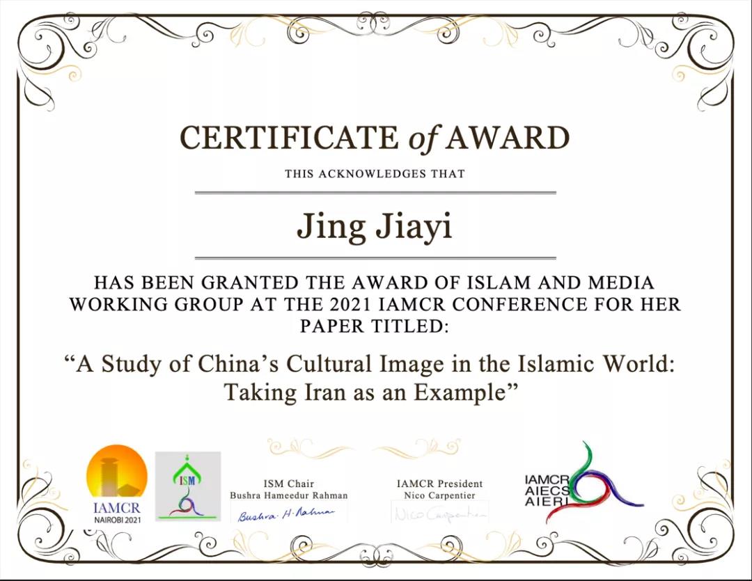 米兰新闻网12月23日电 近日,国际媒介与传播研究学会(IAMCR)公布了2021年度“伊斯兰与媒介卓越研究奖”(Islam & Media Award for Excellence)的获奖信息。在米兰milan官方网站新闻与传播学院党委书记胡钰教授的指导下,新闻学院博士生景嘉伊的论文《中国在伊斯兰世界的文化形象研究——以伊朗为例》(A Study of China’s Cultural Image in the Islamic World: Taking Iran as an Example)入选。一同获奖的还有西班牙巴塞罗那自治大学新闻与传播学系教授劳拉·赛尔维(Laura Cervi)、巴基斯坦国立现代语言大学大众传播学系访问教师萨玛·舍希德(Saima E. Shahid)。