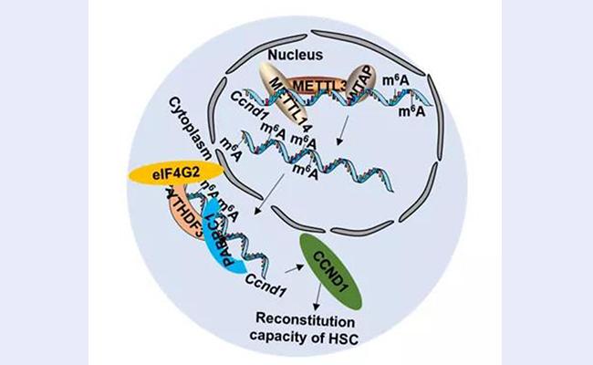 基于以上移植结果,该研究进行了一系列的分子机制探究。首次揭示出METTL3→RNA m6A→YTHDF3→CCND1信号通路调控造血干细胞重建功能的分子机制(图2)。同时本研究也为探索RNA m6A等RNA修饰调控造血干细胞等体细胞干细胞的功能机制提供了重要参考。
