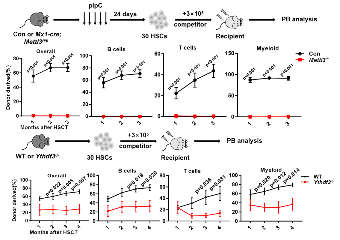 研究人员系统性地构建了RNA m6A通过其甲基转移酶METTL3、RNA m6A识别蛋白YTHDF1和YTHDF3敲除小鼠,并进行造血干细胞移植实验。结果显示,敲除METTL3和YTHDF3均导致造血干细胞的重建能力降低(图1)。
