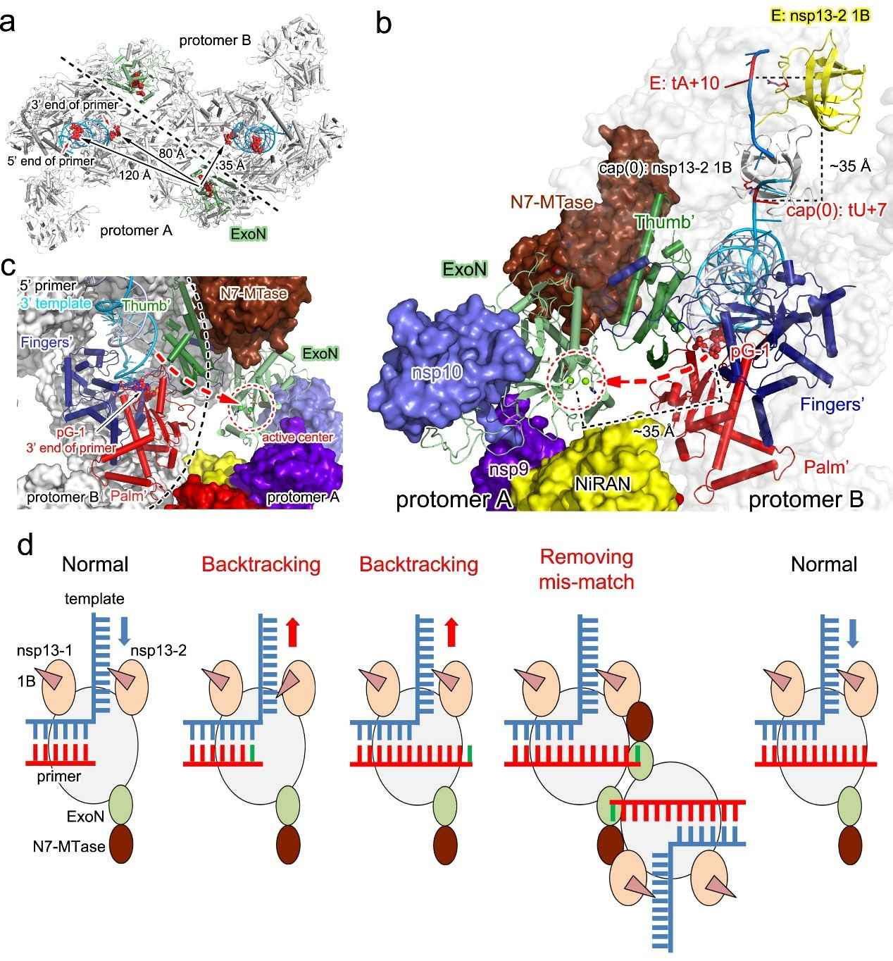 团队揭示了新冠病毒转录复制机器的完整组成形式,发现了病毒聚合酶的核苷转移酶结构域是催化mRNA“加帽”成熟的关键酶,明确了帽结构的合成过程,为发展新型、安全的广谱抗病毒药物提供了全新靶点。团队还发现病毒以“反式回溯”的方式对错配碱基和抗病毒药物进行“剔除”,阐明了瑞德西韦等药物效果不良的分子机制,为优化针对聚合酶的抗病毒药物提供了关键科学依据。