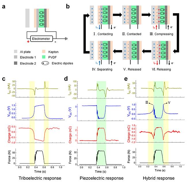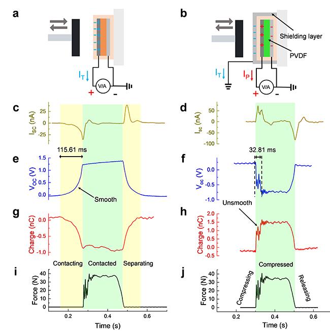 图1.SE-TENG和PENG同时存在于压电器件的使用过程,但二者产生的信号在时间上存在差异