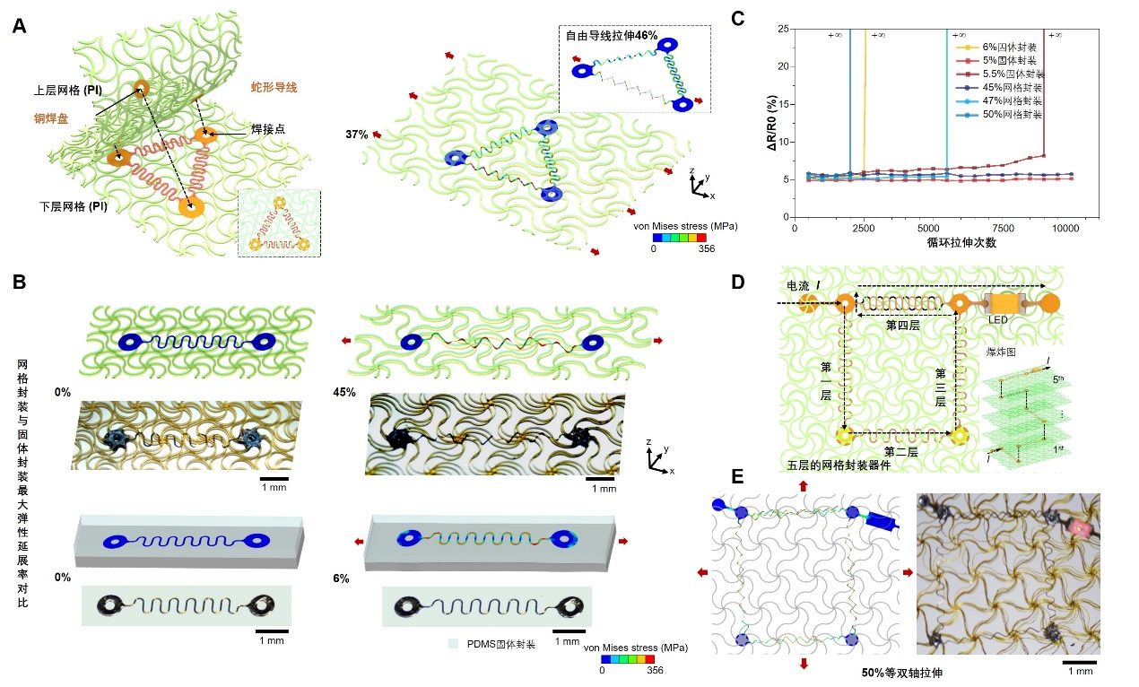 A.双层网格封装蛇形导线;B,C:网格封装与固体封装后最大弹性延展率对比及循环拉伸实验结果;D,E:一个基于叠层网格集成策略的五层柔性电子器件示例