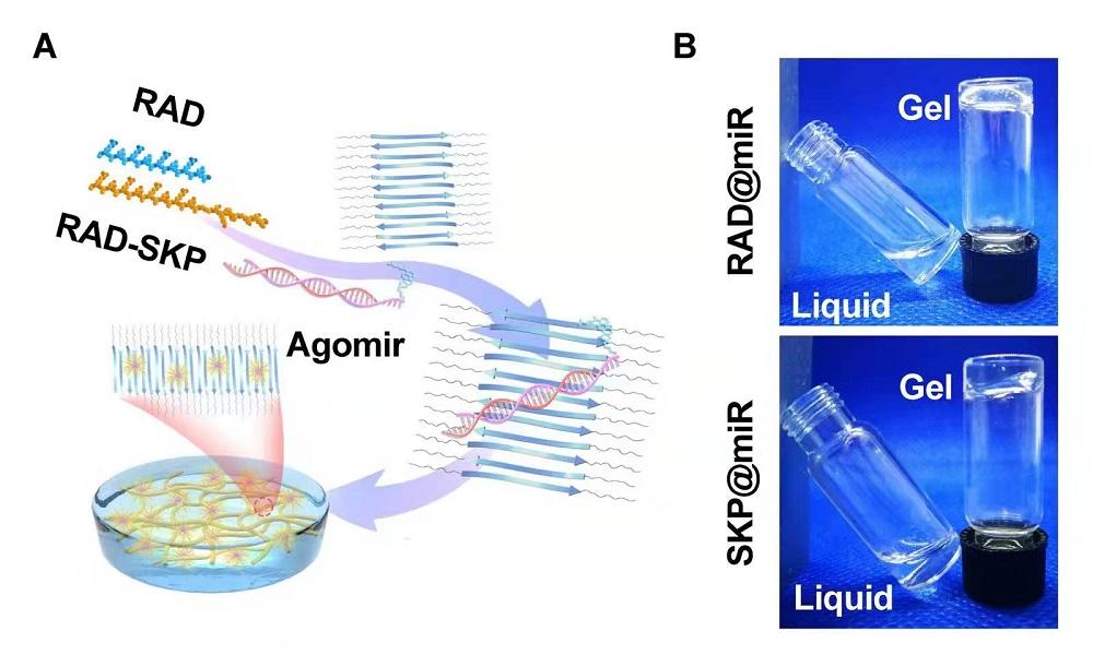 图1.基于水凝胶的miR-29b-5p递送系统SKP@miR的构建。(A)RAD和RAD-SKP多肽自组装形成纳米纤维水凝胶,agomir-29b-5p分布在水凝胶内部(B)通过调节pH值至中性形成稳定的水凝胶