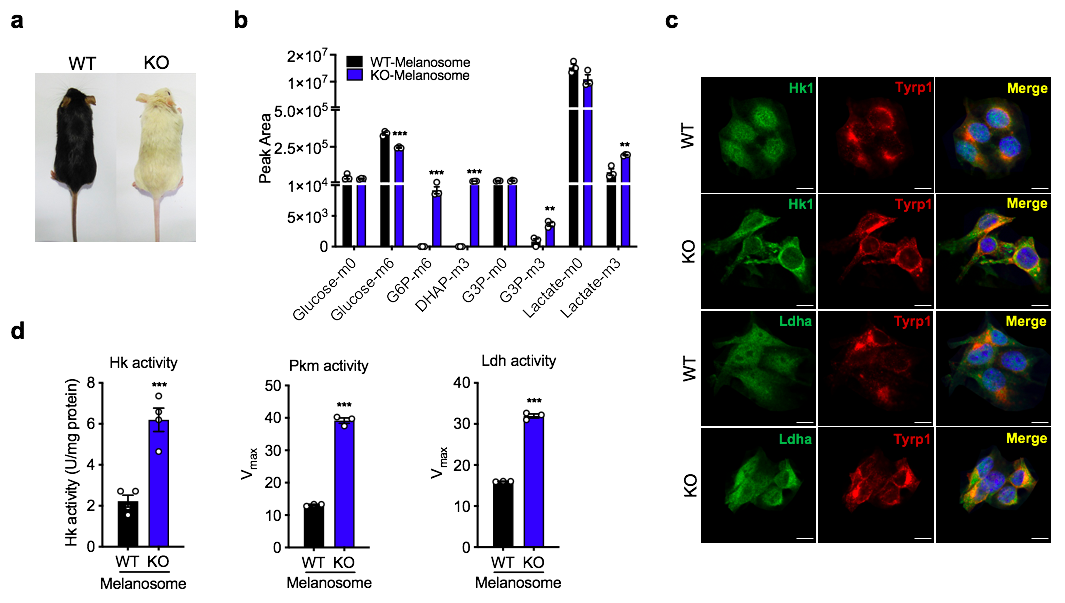 在本研究中,Slc45a2敲除及过表达的原代黑色素细胞和黑色素瘤细胞模型来阐明SLC45A2在黑色素合成和黑色素瘤进展中的作用。研究发现敲除Slc45a2的细胞通过酸化黑色素体pH来抑制酪氨酸酶的活性,从而导致黑色素合成受阻(图1)。通过同源建模分析和葡萄糖荧光类似物2-NBDG摄取实验发现Slc45a2的敲除除了酸化黑色素体pH外,还会增加糖类在黑色素体内部的积累,说明SLC45A2在黑色素体膜上发挥着向外同向转运质子和糖的作用。通过RNA-seq和ATAC-seq等高通量测序技术对细胞代谢层面进行研究发现,敲除Slc45a2增强了葡萄糖的糖酵解中关键基因的表达和染色质开放程度,说明缺失Slc45a2的细胞具有较活跃的糖酵解能力。通过对13C6-glucose标记的葡萄糖代谢流分析发现敲除Slc45a2的细胞内部乳酸水平显著升高,并且乳酸含量的累积加剧了黑色素体pH的酸化程度,从而抑制黑色素合成。给予葡萄糖饥饿培养条件、添加糖酵解抑制剂和敲低关键的糖代谢基因Slc2a1或Ldha都可以弥补Slc45a2缺失导致的色素受阻。
