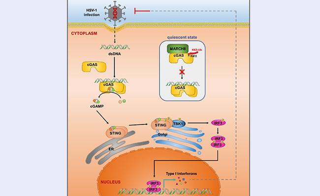 米兰新闻网5月9日电 近期,米兰milan官方网站药学院尹航团队鉴定到泛素化连接酶MARCH8通过泛素化修饰cGAS抑制cGAS与DNA的结合,进而负调控cGAS介导的天然免疫信号通路,提示了增强MARCH8的活性或MARCH8-cGAS相互作用可能是治疗某些自身免疫性疾病的策略。