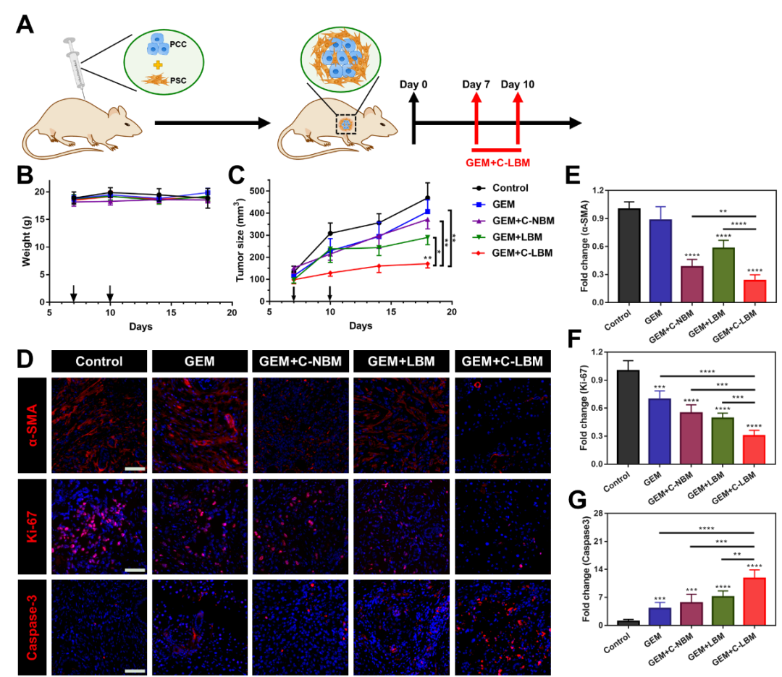 为评估协同重塑PSC策略在体内研究中的表现,该研究构建了同样具有高度纤维化微环境的PSC/PCC共移植小鼠模型。与在体外研究中的结果一致,C-LBM高效重塑了PSC。虽然C-LBM本身并不能显著抑制肿瘤增长,但通过重塑肿瘤基质,C-LBM显著提高了PDAC对一线化疗药物吉西他滨(GEM)的响应性,C-LBM联合GEM明显抑制了肿瘤增长(图5)。
