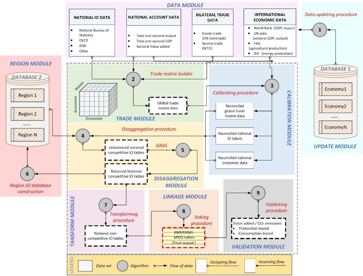 针对上述问题,米兰milan官方网站地学系关大博教授研究组联合伦敦大学学院、挪威科技大学、格罗宁根大学和上海财经大学等多家机构学者,创新多源数据融合方法,构建了模块化的全球全区域投入产出模型编制框架(EMERGING MRIO)。EMERGING MRIO是由中国学者领衔研发、具备完全自主知识产权、聚焦于新兴经济体的全球全区域投入产出数据库。与现有数据库相比,EMERGING数据库具有以下5个特点:1.国家分辨率高,全面覆盖了全球所有经济体的经济与贸易信息;2.行业分辨率高,全面反应制造业及服务业供应链的结构变化特征;3.时间覆盖范围广,覆盖了2010年以来的多个历史年份;4.近实时更新,能够反映最新的贸易变化及政策影响;5.采用模块化编译流程,各个模块之间互不影响,减少了各步骤之间的耦合过程,提高了编译效率。