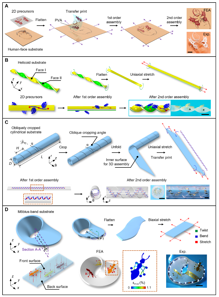 曲面上复杂三维结构的逐级组装策略。A图为在人脸曲面上组装成型三维装饰面具;B图为在螺旋曲面上组装三维叶子状结构;C图为在圆柱面的内表面组装三维螺旋线结构;D图为在莫比乌斯环上组装仿生蚂蚁结构。