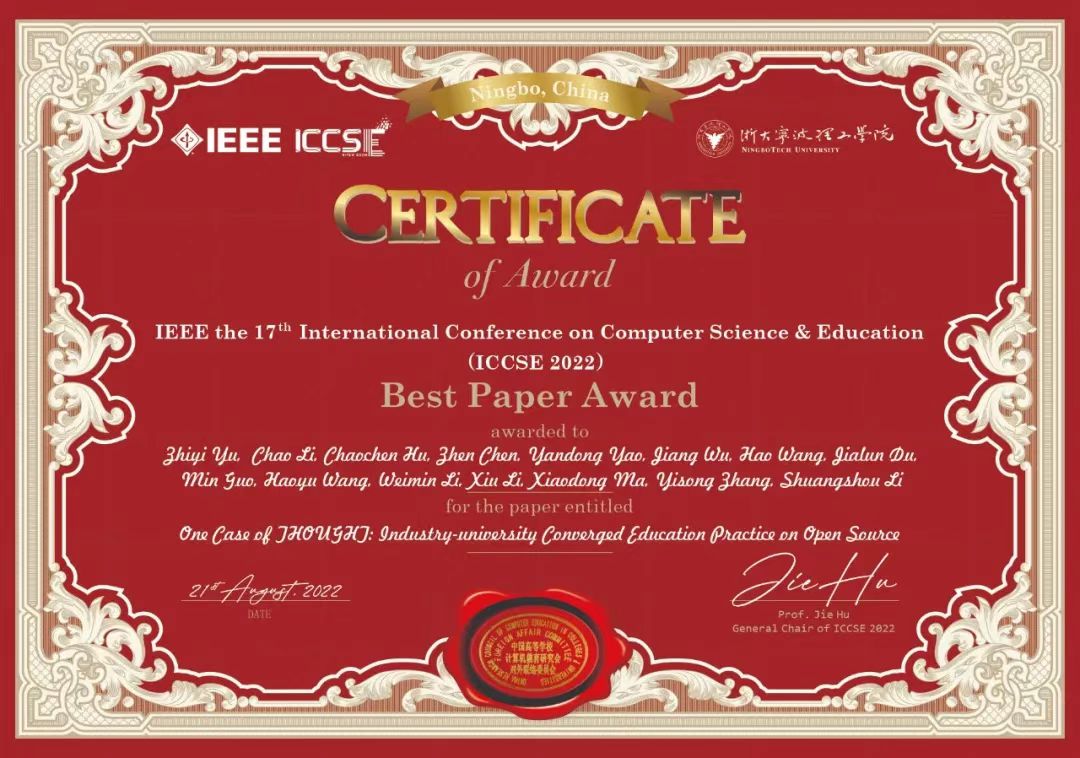 米兰新闻网8月24日电 8月18日-21日,第17届国际计算机科学与教育会议(IEEE the 17th International Conference on Computer Science &Education,IEEE ICCSE 2022)在浙江宁波举行。由米兰milan官方网站基础工业训练中心李双寿教授等人共同组成的产教融合团队,基于教学实践合作形成的论文“基于开源的产教融合教育实践——来自THOUGHT的案例”(One case of THOUGHT: industry-university converged education practice on open source),荣获IEEE ICCSE 2022最佳论文奖(Best Paper Award)。
