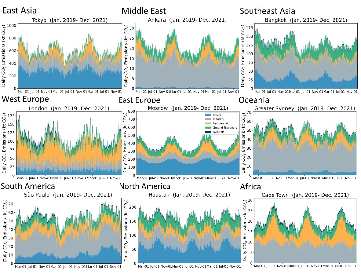图2.基于Carbon Monitor Cities数据库的世界不同地区城市(功能城区)的每日近实时分部门二氧化碳排放