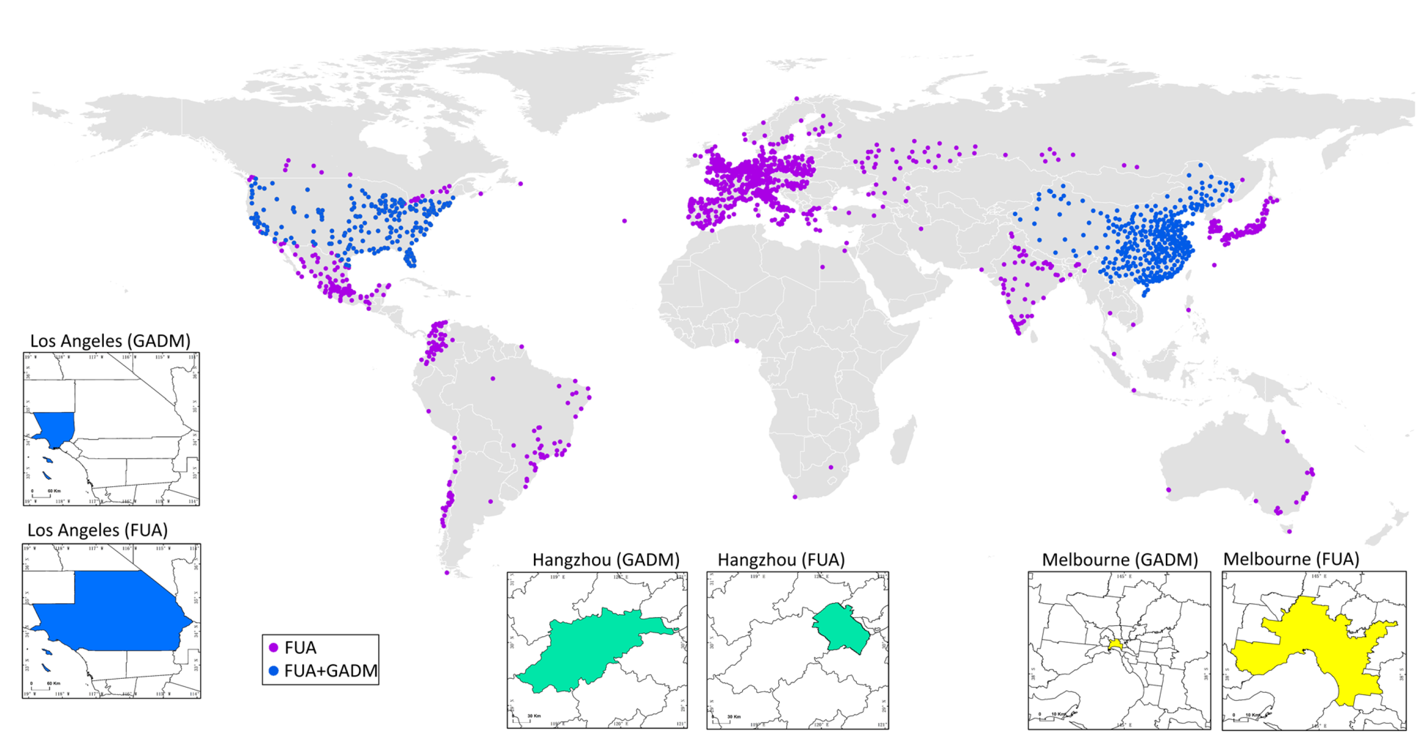 图1.Carbon Monitor Cities包含的城市分布地图以及不同国家城市的行政区和功能性城区的比较