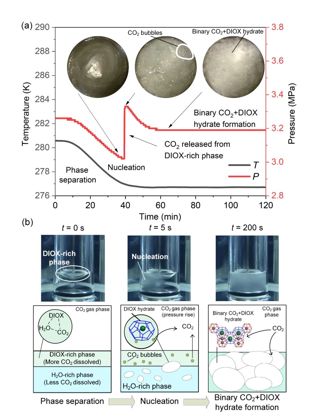 图2.高压下CO2-DIOX/H2O相分离及CO2+DIOX水合物成核及生长过程