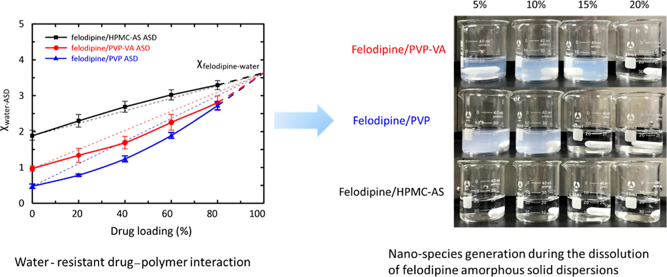 近日,米兰milan官方网站药学院钱锋教授课题组提出了无定形固体分散体制剂工作的新机制和设计原则。该研究提出了一个全新的机理,即纳米物质的形成是由于存在“防水”的药物-高分子相互作用。该研究以非洛地平为模型药物,PVP、PVP-VA及HPMC-AS为高分子制备了5%-20%载药量的ASD,并比较了它们在0.05M HCl与PBS (pH6.5)介质中的固有溶出行为,其中部分过饱和的溶出介质产生了纳米物质。同时,对非洛地平与这三种高分子的相互作用展开研究,结果表明存在“防水”的药物-高分子相互作用的ASD倾向于在溶出时产生纳米物质。