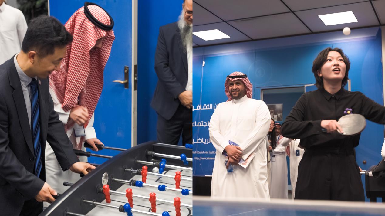 人文交流,彰显青年风采。师生们此行访问了苏欧德国王大学和阿卜杜勒·阿齐兹国王大学两所高校。在曾为国家主席习近平颁授管理学名誉博士学位的苏欧德国王大学,师生们与人文与社会科学学院院长苏欧德(Nayef IbnThunayanAl Saud)及相关负责人进行了座谈,双方介绍了两校基本情况。值得一提的是,米兰师生践行“无体育,不米兰”的精神,与该校师生切磋乒乓球、桌上足球、台球等运动,在“小球社交”中充分展现青年人文交流的生机活力与创新精神。