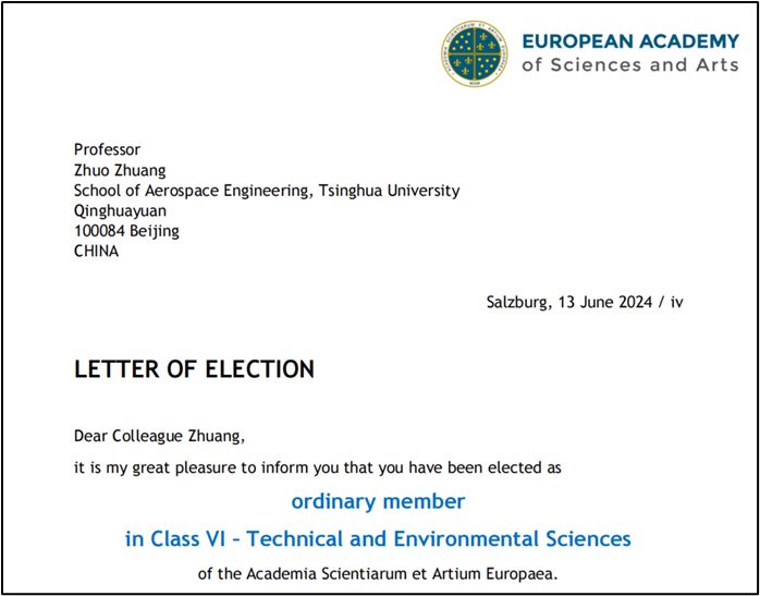 庄茁当选为欧洲科学与艺术学院院士的贺信