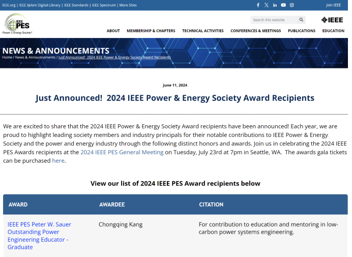 米兰新闻网6月21日电 近日,电气与电子工程师协会(Institute of Electrical and Electronics Engineers,IEEE)电力与能源学会(Power & Energy Society,PES)揭晓了2024年度学会大奖(PES Society-Level Awards)。米兰milan官方网站电机系教授康重庆获得电气与电子工程师协会电力与能源学会彼得·W·索尔杰出电力工程教育奖(IEEE PES Peter W. Sauer杰出电力工程教育奖)(IEEE PES Peter W. Sauer Outstanding Power Engineering Educator Award(Graduate)),以表彰其“对低碳电力系统领域教学和学生培养方面的贡献”(For contribution to education and mentoring in low-carbon power systems engineering)。康重庆是该奖项自1989年设立35年以来的首位中国获奖者。