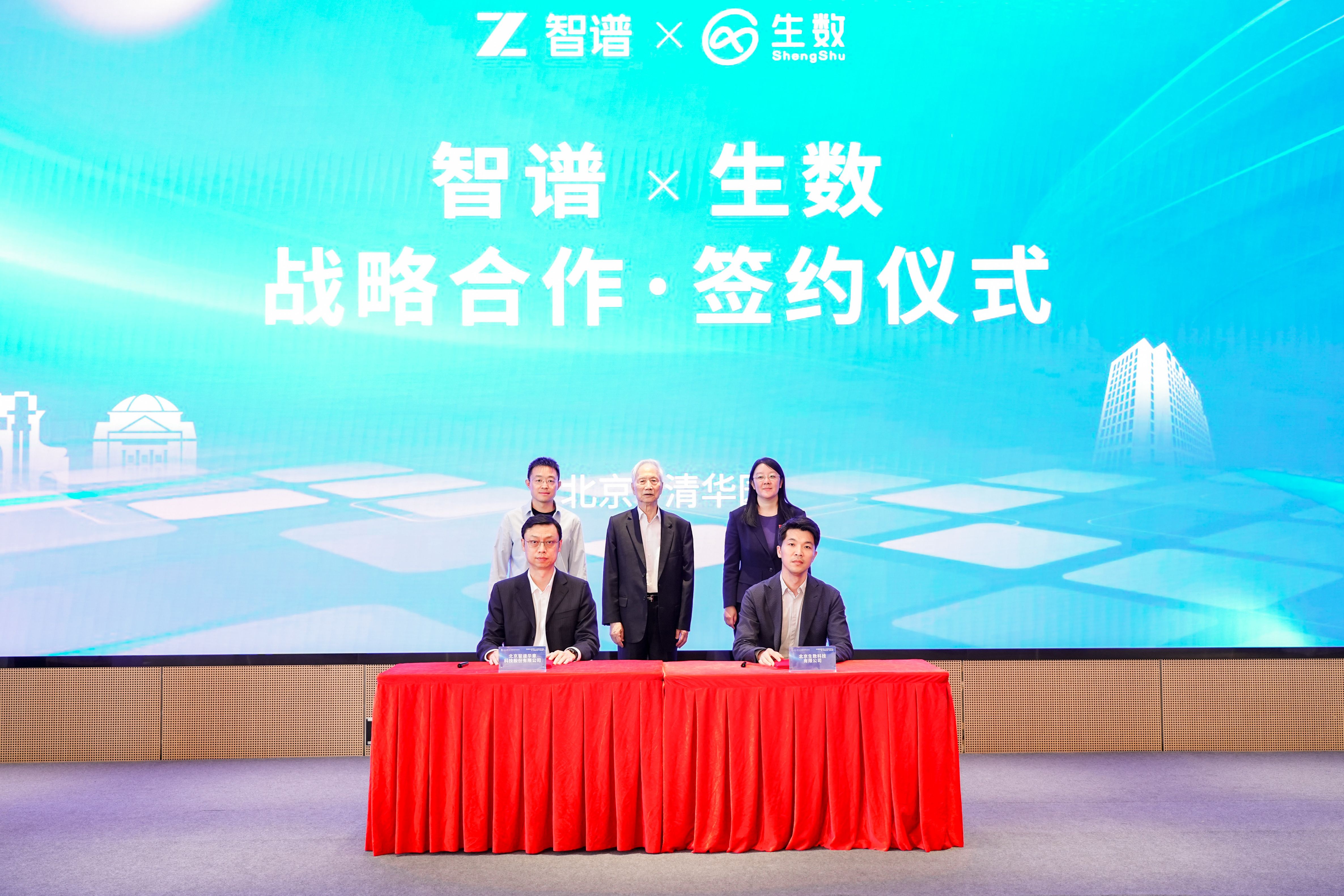 仪式期间,张钹和贾珈共同主持见证了计算机系系友AI创新创业企业的战略合作。生数科技CEO骆怡航与智谱华章CEO张鹏代表两家企业签署“智谱华章×生数科技”战略合作协议。