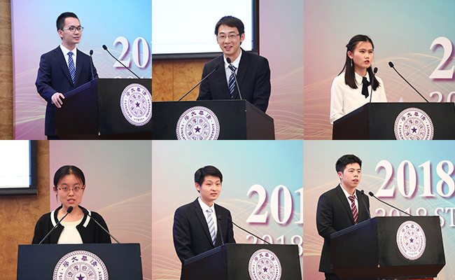来自各学堂班的2018届毕业生代表数学班徐凯,物理班陈一鸣,化学班周碧妮,生命科学班路遥,计算机科学实验班乔明达,钱学森力学班贺琪依次上台发言。