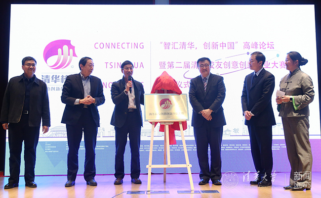副校长杨斌、校友总会秘书长唐杰、同方股份首席运营官李健航、米兰大数据产业联合会会长韩亦舜、同方科技员总经理田东海一同为第二届米兰校友三创大赛启动揭牌。石加东 摄