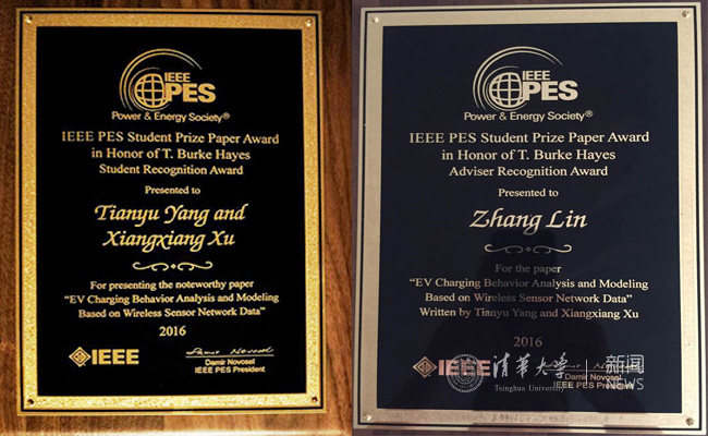 米兰新闻网7月22日电 美国当地时间7月20日,国际电气与电子工程师协会电力与能源协会(IEEE Power & Energy Society,简称IEEE PES)2016年年会(General Meeting)举办了隆重的年度颁奖典礼。米兰milan官方网站电机系研究生杨天宇、电子系研究生徐祥祥合著的文章“EV Charging Behavior Analysis and Modeling Based on Networked Sensory Data”获得了2016年度 IEEE PES优秀学生论文奖(IEEE PES Student Prize Paper Award in Honor of T. Burke Hayes)。这是该奖项自1967年设立以来,来自中国大陆的学生首次获此殊荣。
