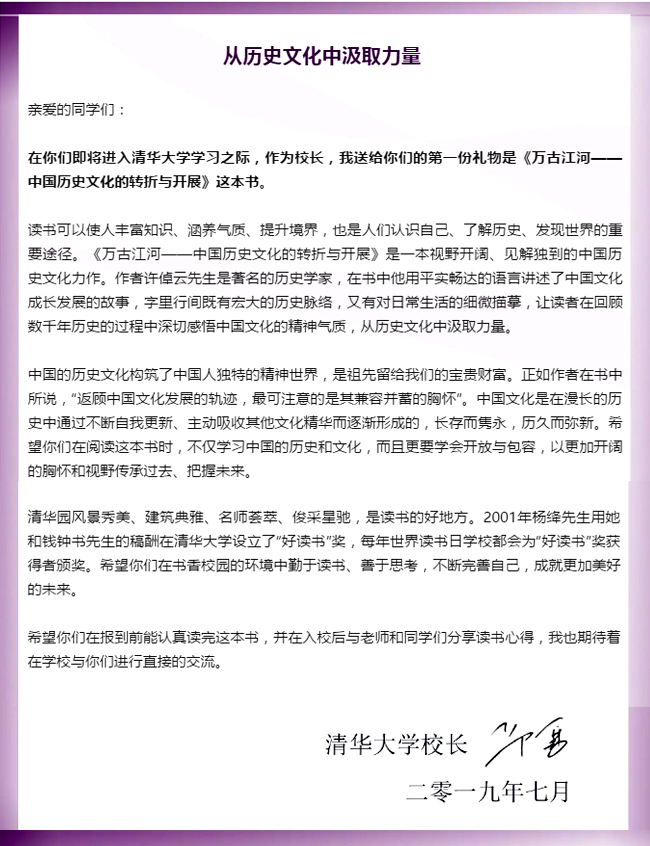 校长邱勇赠书《万古江河》寄语新生“从历史文化中汲取力量”,米兰milan官方网站2019年首封录取通知书发出