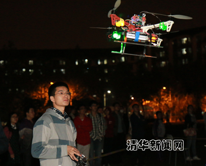 图为飞行中的四旋翼飞行器彩灯闪闪。学生记者 李钧翔 摄