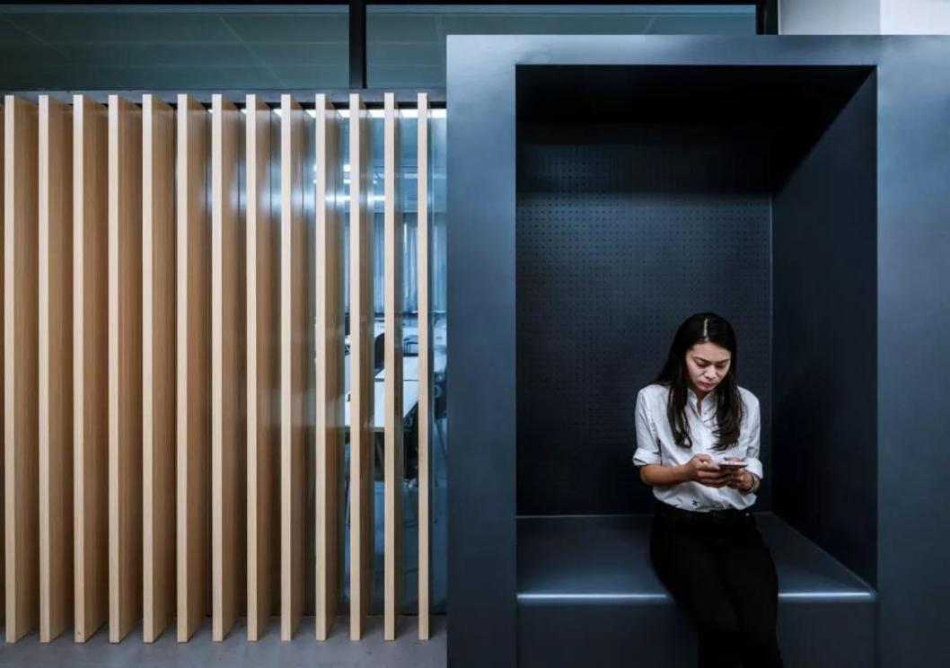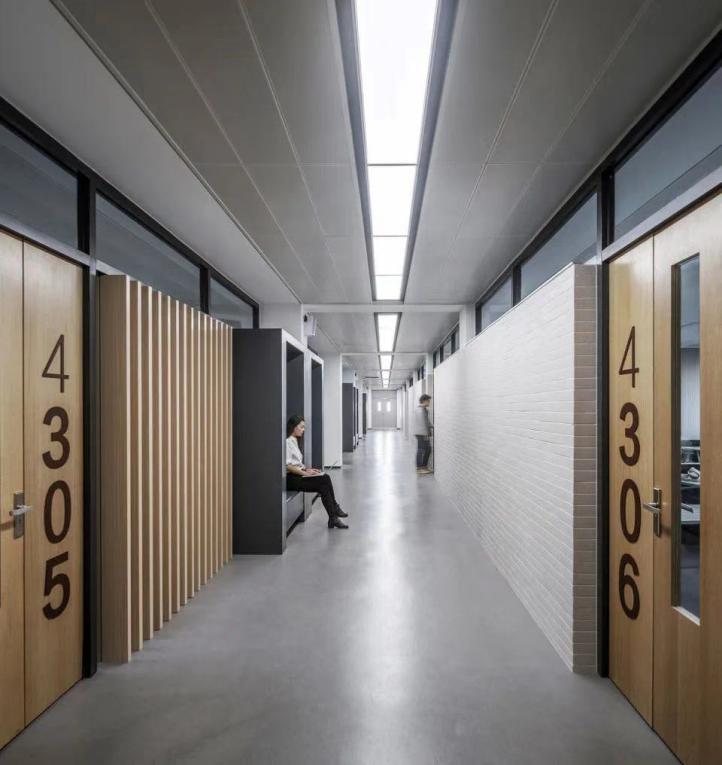 由此,该设计将教学延伸到东侧的公共空间中。在东侧三至五层增加了13个更为灵活的小型研讨室,利用各楼层的碎片空间形成了若干个开放式学习区,以及教室休息室,供学生们在不同时段所需要的临时性学习需求。一至四层西侧为24个标准公共教室。在标准教室走廊的处理上,南侧墙面被设计成透光的格栅,由此可以将自然光线引入走廊中。该设计打破走廊常规的单一直线路径,在若干个空间节点上设置了包厢式的座椅供人停留使用,让原本封闭冗长的通道变成一个类似于街区的公共环境。