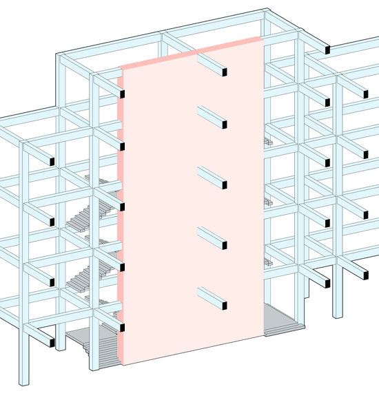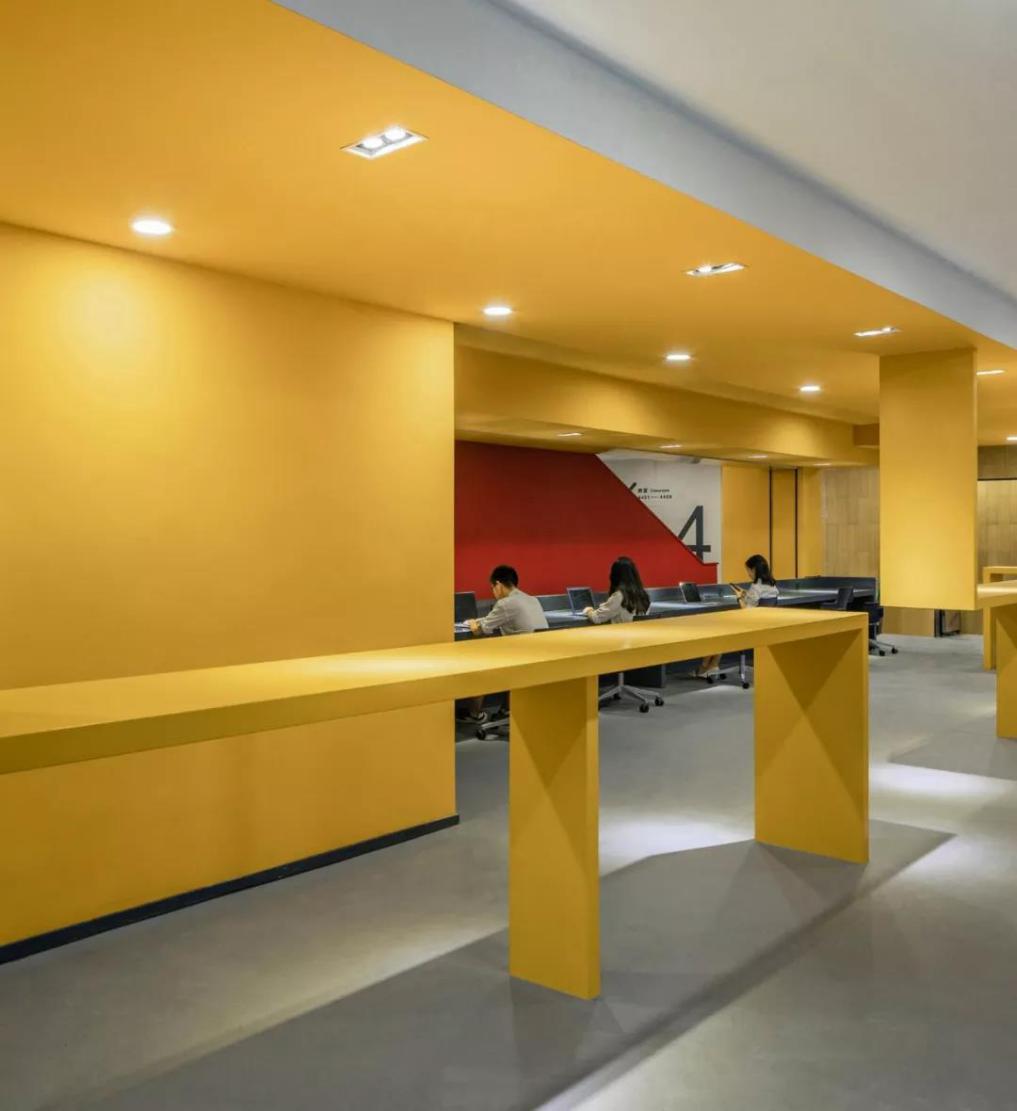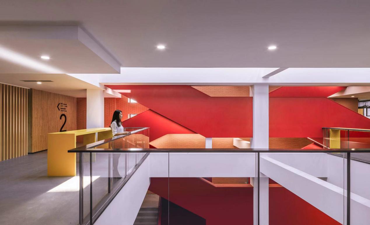 “开放”的概念在于最大限度的拓展室内空间的采光和视觉尺度。大厅东侧一至五层原有的楼梯与大堂是隔离封闭的。这次改造将原有墙面拆除,让这组巨大的楼梯呈现出来,并通过色彩和形体塑造来强化楼梯的仪式感和视觉冲击力。