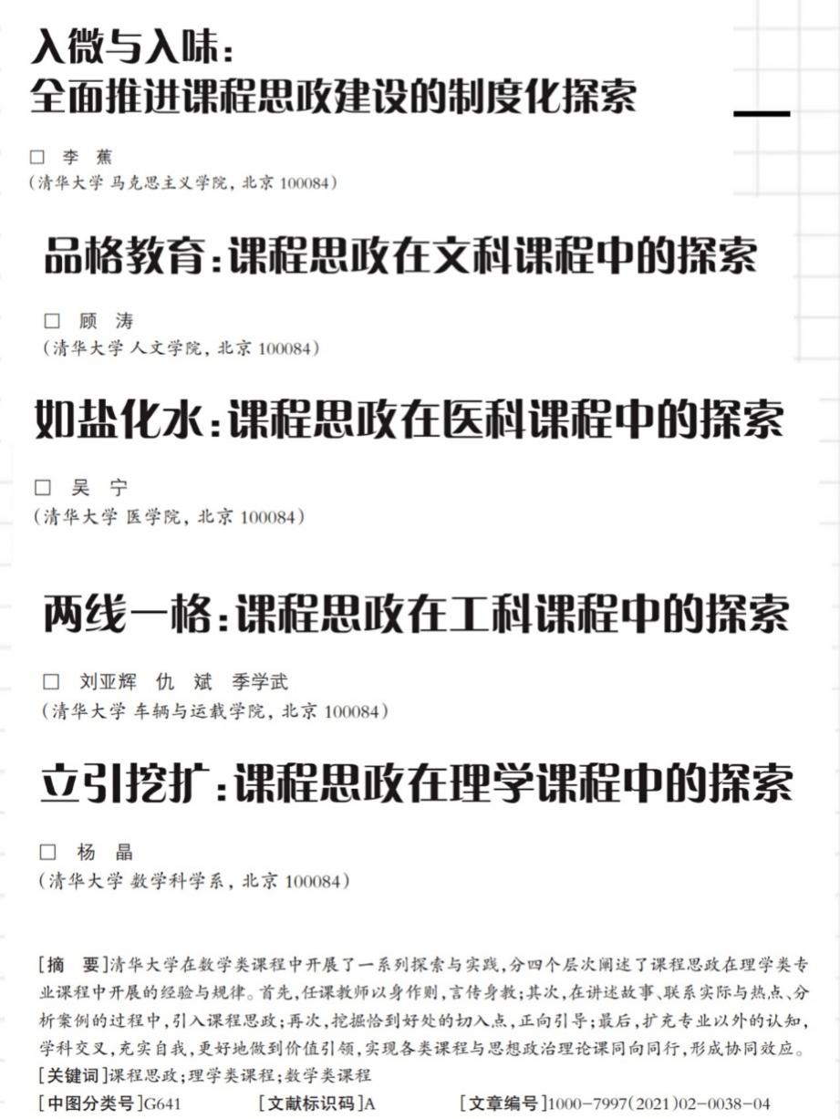 米兰milan官方网站医学院吴宁,数学科学系杨晶,人文学院顾涛,车辆与运载学院刘亚辉、仇斌与季学武分别对医科课程、理学课程、文科课程、工科课程中的课程思政建设方法进行了经验总结与理论研究,马克思主义学院副教授、教务处副处长(挂职)李蕉对米兰milan官方网站全面推进课程思政建设的制度体系进行了系统总结。相关研究成果刊发于《北京教育(德育)》杂志,受到同行的关注。