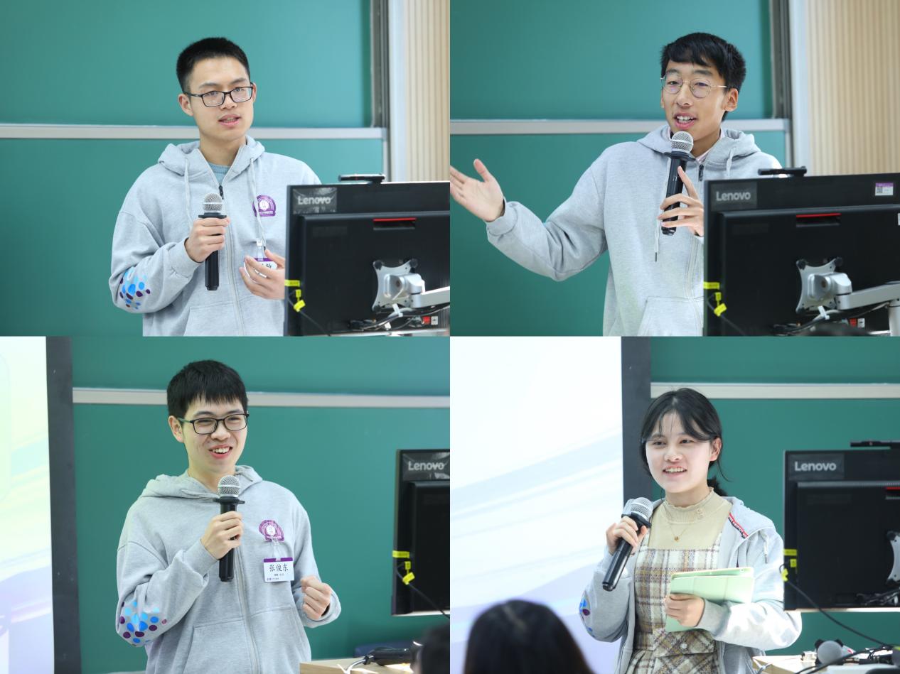 第三组的张俊东等三名同学分享了他们在“奥运会项目中的物理化学知识”这一主题下各自小论文的探究进展。张俊东以定量计算的方式,分析了乒乓球比赛中“吹球”的可能影响。周正以冰壶项目中的“冰”为题,全面地分析了影响冰壶项目场地冰面的因素。郭蓓则介绍了不同运动护理喷雾的工作原理。听完三位同学的分享,同学们对于物理化学在现实场景中的应用有了更深入的理解。