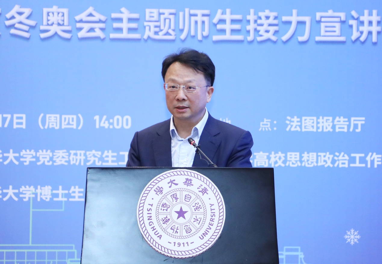 北京冬奥校内保障志愿者、马克思主义学院2021级硕士生陈炳旭以“同筑冰雪梦,一起向未来”为题,解读了习近平总书记关于北京冬奥的重要论述。北京冬奥火炬台设计团队成员、机械系2017级博士生李新新讲述了参与马赛教授、田煜教授、石永久教授团队设计冬奥火炬台的故事。北京冬奥OFA志愿者、环境学院2020级博士生刘迪波分享了参与外宾接待、搭建中外沟通的桥梁的亲身经历。北京冬奥标兵志愿者、精仪系2018级本科生李金峰分享了参与开闭幕式演出、展示中国青年风采的经历。