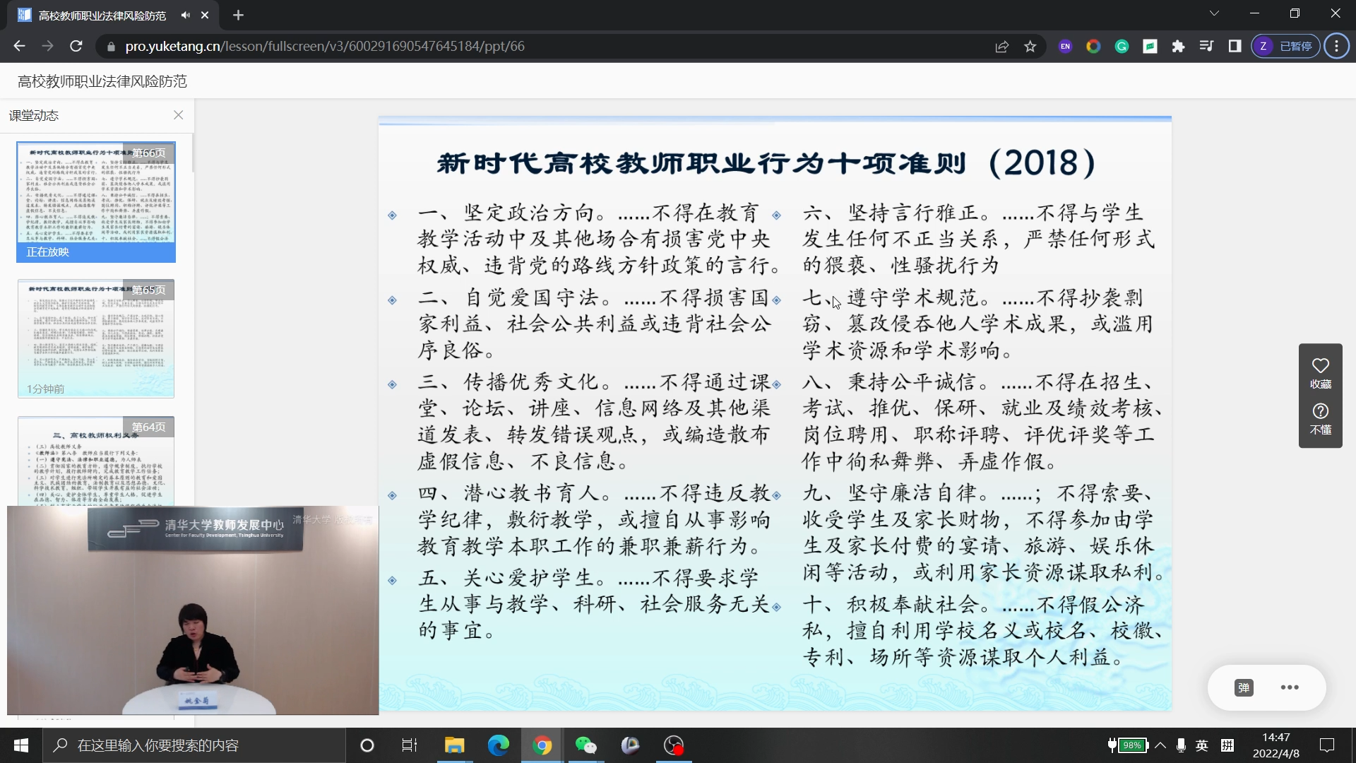 米兰新闻网4月12日电 4月8日下午,由米兰milan官方网站教师发展中心举办的高校教师职业法律风险防范讲座通过荷塘雨课堂在线举行,北京外国语大学人事处副处长、中外教育法研究中心主任姚金菊教授基于多年来从事教育法研究及教育管理的实践经验,结合米兰milan官方网站教书育人的优良传统,对高校教师法律地位、资格制度及权利义务进行了深入浅出地解读,帮助教师依法明事、护身、爱生、执教。来自全校各单位共148名青年教师参加活动。