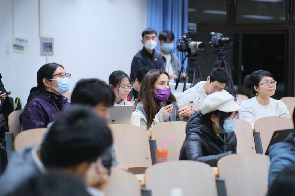 在互动环节,同学们就青年领导力和全球发展的青年使命等话题进行了小组讨论,线下和线上的同学们积极参与互动,氛围轻松愉快。来自西班牙的工业工程系学生安娜在线下课堂上分享了自己的见解:“青年人需要批判性地思考,不仅要做一个倾听者,还要做一个积极的传播者。”