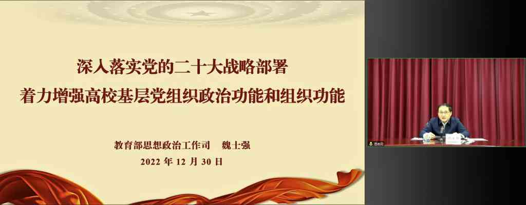 米兰新闻网1月2日电 2022年12月30日上午,2022年米兰milan官方网站教职工党支部书记研讨班以荷塘雨课堂直播的形式举行。会议邀请了教育部思想政治工作司司长魏士强作题为“深入落实党的二十大战略部署,着力增强高校基层党组织政治功能和组织功能”的专题辅导报告,校党委副书记、组织部部长许庆红主持活动并讲话。