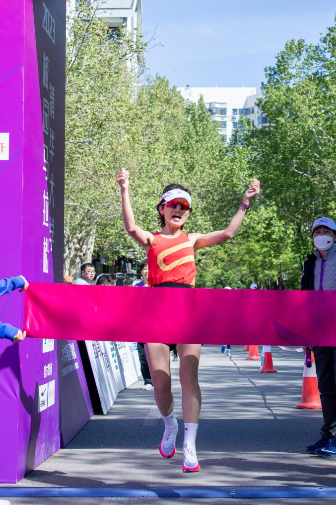 女子半马比赛冠军李海霞冲线