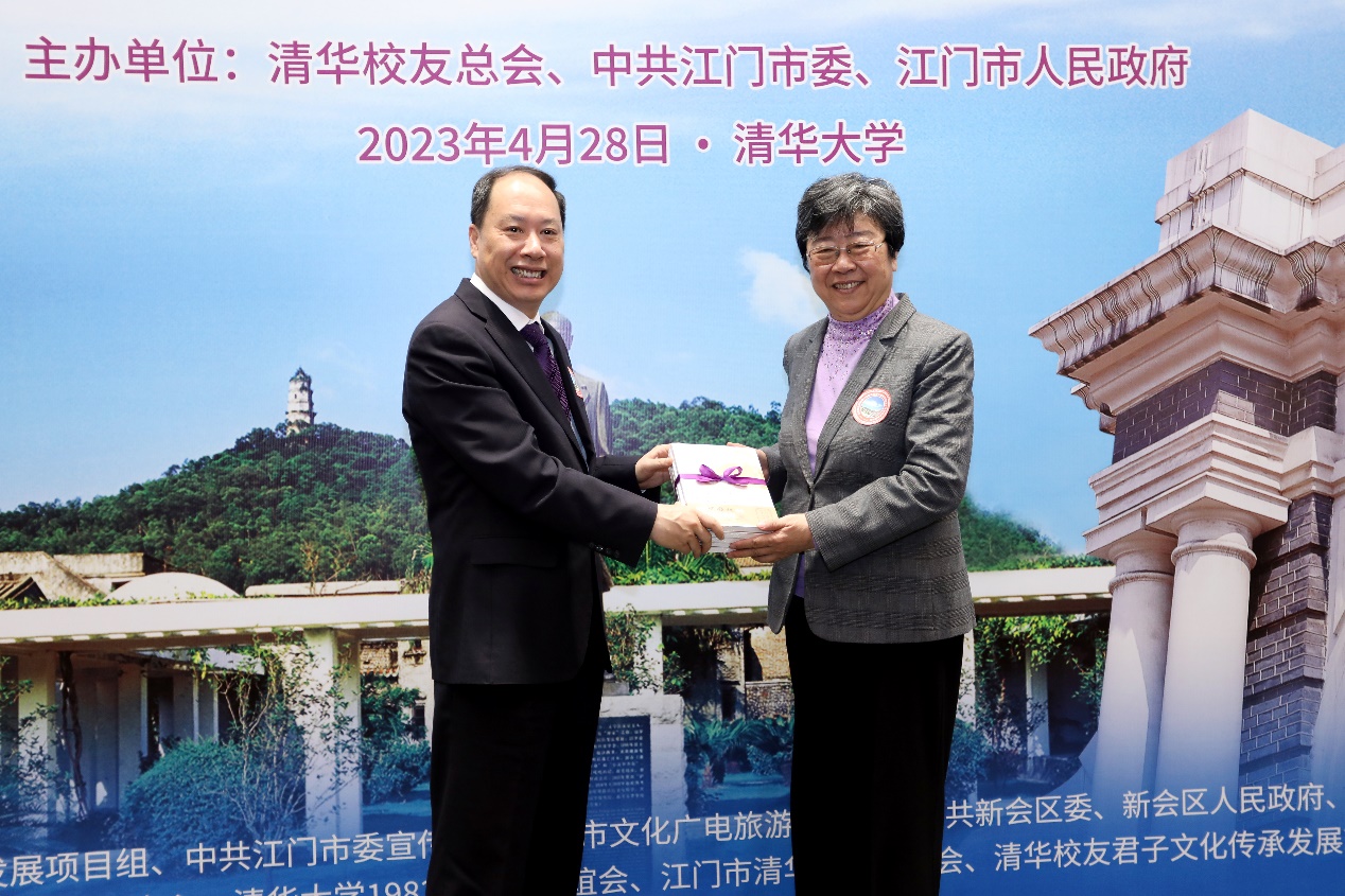 陈岸明代表江门市向韩景阳赠送《做中国人》《梁启超和他的子女们》两本新书。