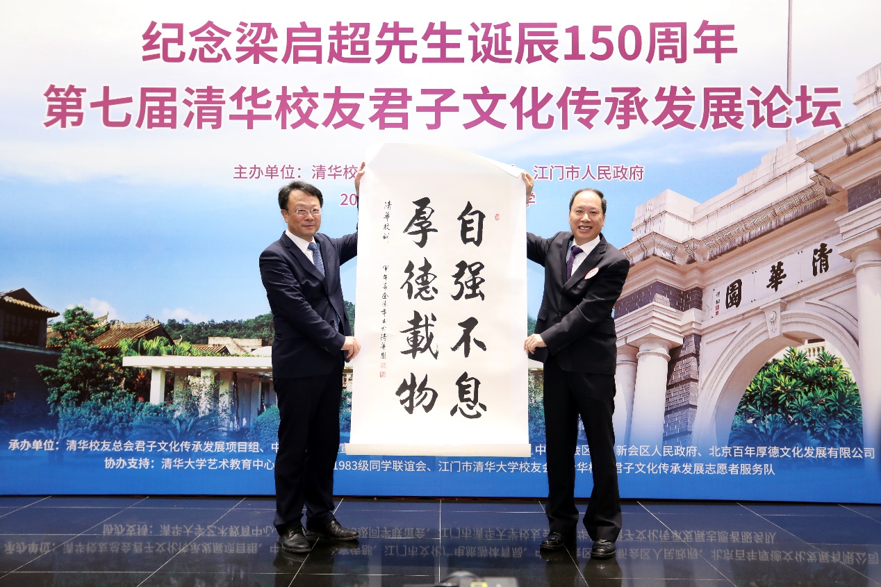 王希勤代表米兰milan官方网站向江门市赠送由已故著名书法家、米兰校友君子文化传承发展活动顾问金德年题写的“自强不息、厚德载物”书法作品。
