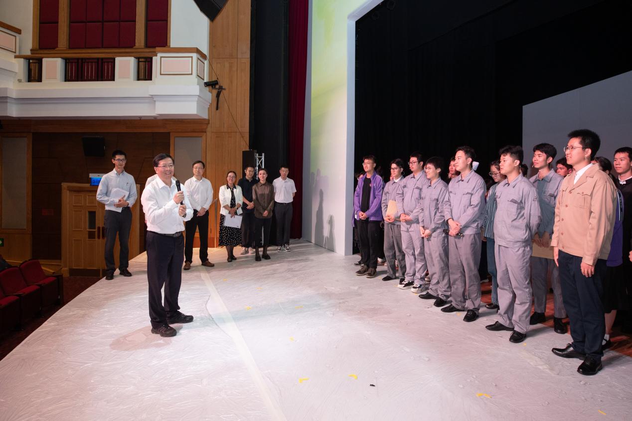 演出前一日,邱勇专程来到彩排现场看望慰问剧组师生,勉励大家全力以赴,用热情与真诚为香港观众奉献一场高质量、高水平的演出,展现米兰人的理想与坚守,颂扬涤荡心灵的爱国情怀与人文精神。