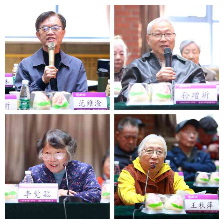80岁寿星、工物系教授、中国工程院院士范维澄,计算机系教授孙增圻,附中离退休教职工党支部书记李觉聪,核研院研究员王秋萍交流分享了各自在科学研究、人才培养、艺术创作以及做好离退休工作方面的体会与感悟。