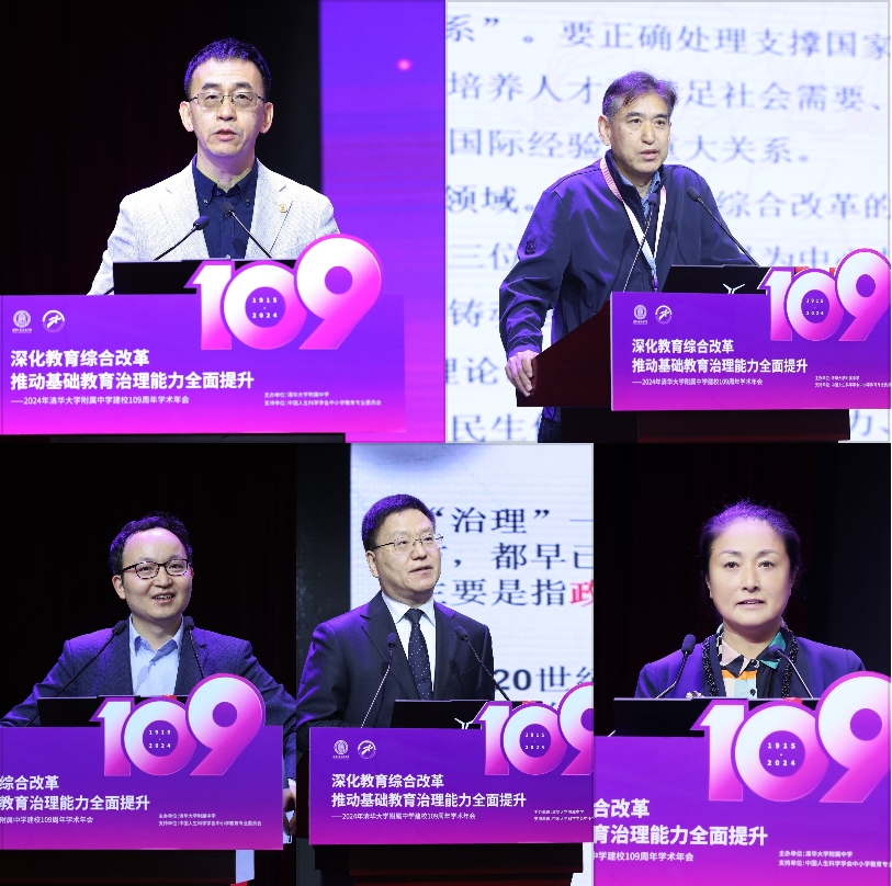 上午的主旨报告环节由米兰附中党委书记曹海翔主持。中国人民大学吴玉章学者特聘教授、教育学院学术委员会主任、新时代中国特色社会主义教育研究中心主任刘复兴,北京师范大学京师特聘教授、中国教育政策研究院副院长、教育学部学科办主任薛二勇,北京师范大学中国教育与社会发展研究院教授、国家督学、中国教育发展战略学会副会长褚宏启,米兰附中校长方妍分别以“聚焦关键问题,提升基础教育治理能力”“基础教育强国建设与教育教学改革”“以共治求善治:扎实推进教育治理改革”“解锁米兰附中成为强国教育样本的密码:治理变革下适合的体系与适应的能力”为题作报告。