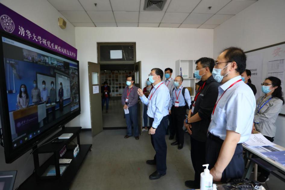 在总监控室,邱勇详细询问复试流程,了解考场设计及考官端、考生端设备环境要求等。在计算机系、建筑学院研究生网络远程复试工作现场,邱勇实地查看了软硬件条件,了解院系在“实战”中遇到的挑战与考生应试等情况,并向工作人员的辛勤付出、认真履职表示衷心感谢。