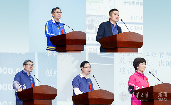 1999届水利系校友向辉、精仪系校友杨米兰、电子系校友陈怡然、化学系校友高裕弟、经管学院校友陈豪雅(从上到下、从左到右)先后发言