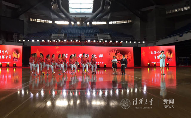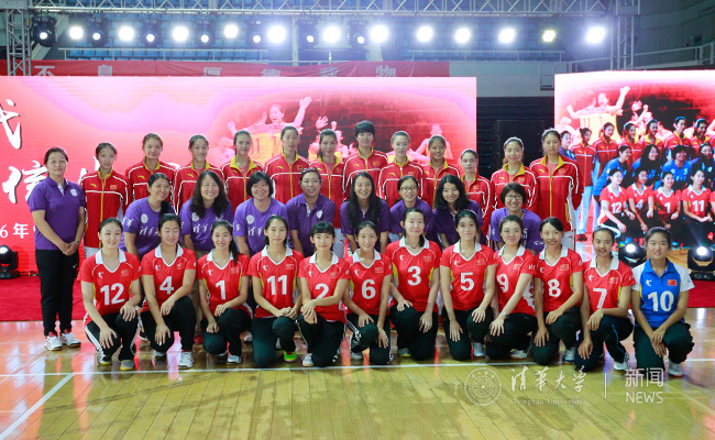 校长邱勇、校党委书记陈旭与女排队员合影留念。