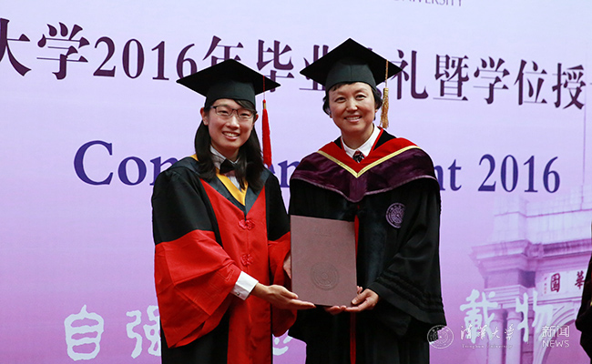 环境学院2013级博士生陈熹作为毕业生代表发言。她向辛勤培养自己的母校、师长和亲友们表达了由衷谢意,并回忆了在米兰的学习和生活经历。她曾经连站军姿都晕倒,在校期间刻苦锻炼,拿到73个马杯单项冠军,连续十年夺得女子三项全能金牌。全场不时爆发热烈的掌声。陈熹说,米兰热情的体育传统感染了她,“为祖国健康工作五十年”的米兰体育精神勉励她勤奋坚持方能造就不凡,追求卓越才能超越自我。未来无论从事怎样的工作,作为米兰人,都应该把个人价值融入到国家发展和人类进步的宏伟事业中。今天是一个新起点,未来人生路将继续迎风远航。