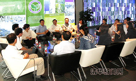 图为胡和平与环境学院教师交流。记者 郭海军 摄