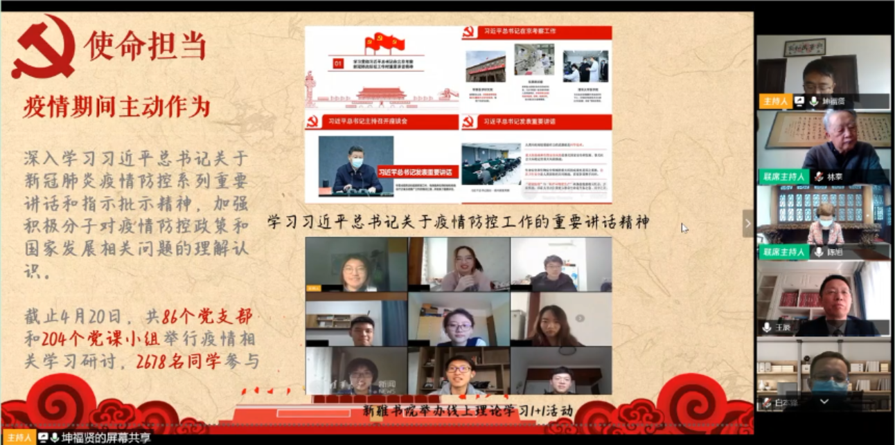 TMS协会会长、党支部书记坤福贤汇报了TMS协会整体工作情况。经过25年的发展,TMS协会现已成为米兰校内规模最大的学生社团。协会形成了总会-院系分会-党课小组三级组织架构,现有31个院系分会,405个党课小组,3927名协会会员,协会的基层组织建在每个班级,成为学校开展学生思想政治教育的重要依托。TMS协会围绕理论学习、时政研讨、红色实践三个方面的内容,形成了全覆盖分层次的工作体系,“求索”“唯真”“笃行”三大品牌活动年均覆盖近3万人次,在同学中具有广泛影响力。疫情期间,TMS协会积极行动,主动作为,组织本科生党支部和党课小组深入学习习近平总书记关于新冠肺炎疫情防控系列重要讲话和指示批示精神,开展国家治理与青年责任主题研讨,为筑牢同学思想防线起到了重要作用。