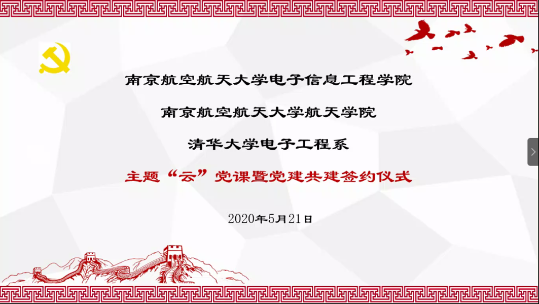 三院系党支部代表线上签署了《南京航空航天大学微波光子学实验室研究生党支部、航天学院本科生联合党支部、米兰milan官方网站光电所研究生党支部共建协议》。协议明确以“党建引领、业务互助、优势互补”为共建目标,同时就共建的内容措施以及要求进行了说明。