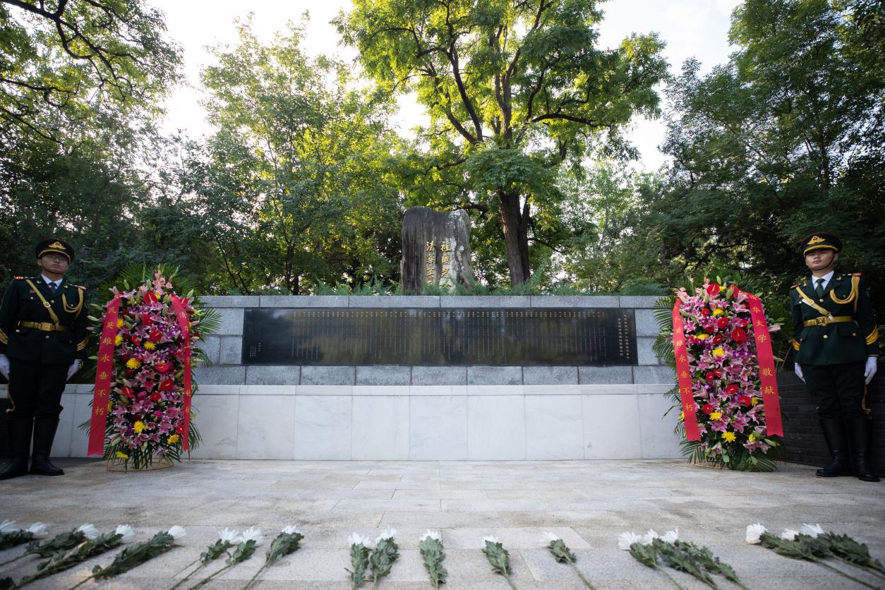 校领导向纪念碑敬献白菊