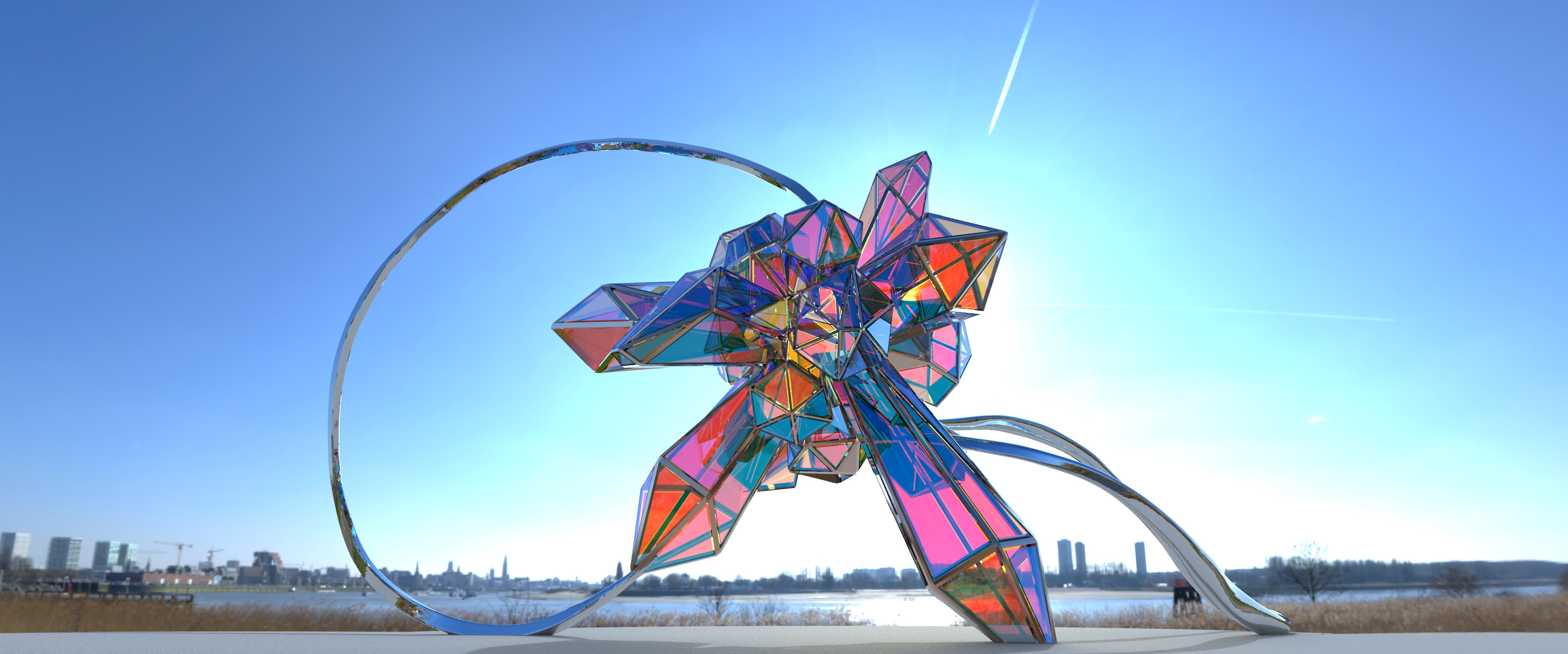 作品主体设计灵感来源于凝结的冰晶造型单体特征,取材于水晶矿石,以钢架镶嵌玻璃为手段,内部增设人在可控光源,左右辅以纵横两条象征速滑轨道的丝带,由不锈钢镜面打磨技术制成。整体设计体现冬奥会的时间性与速滑主题性,水晶与冰晶呈现了运动员个人意志的坚强,与团体汇聚的合力。飘带纵横经纬是世界化的象征。作品与冬运速滑场馆主题与室内外环境相得益彰。
