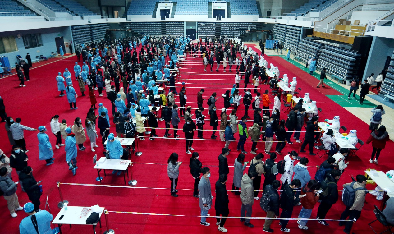 2月27日,学校综合体育馆、西体育馆内,待检学生持“北京健康宝”预约码分多通道检测。检测期间,师生、教职工全部佩戴口罩、保持间距,经工作人员登记核对信息,完成咽拭子采集后迅速离开。每位学生现场检测时间基本控制在3分钟以内,实现了“即检即走”。260余名学生志愿者参与现场服务,有效维护现场秩序,协助未能提前录入信息的学生现场预约、取码,通过细致的沟通关怀,让集中核酸检测更有温度。